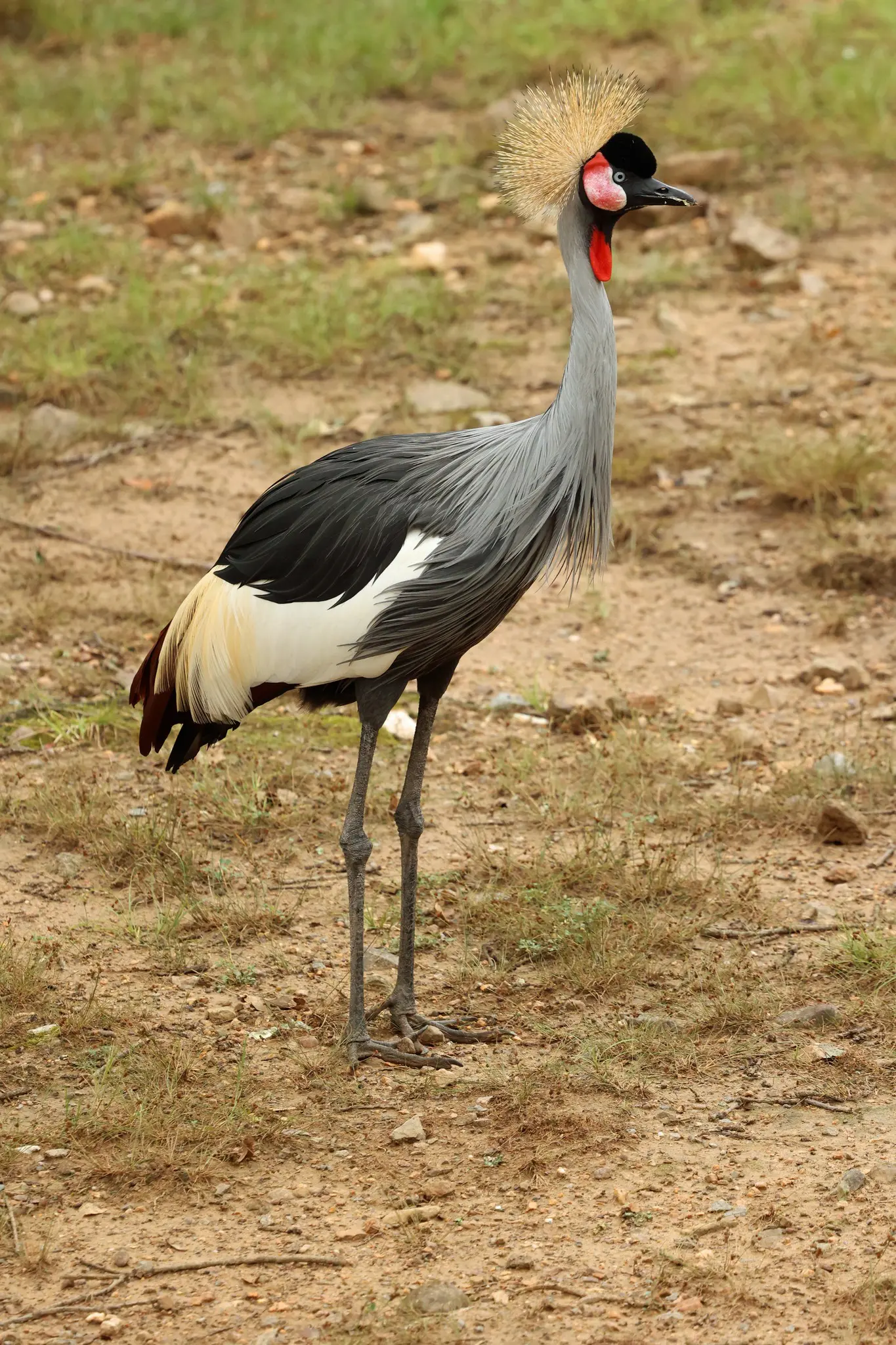 The crane has grey plumage which contrasts against its black and white wings. They have a yellow crest of feathers on top of its head and a red patch that hangs from the neck. The yellow feathers on their head or crown offer camouflage in the tall grasses. Males are larger than females. Juveniles have gray plumage and a dark crest. They live up to 22 years in the wild and 25 years in captivity.