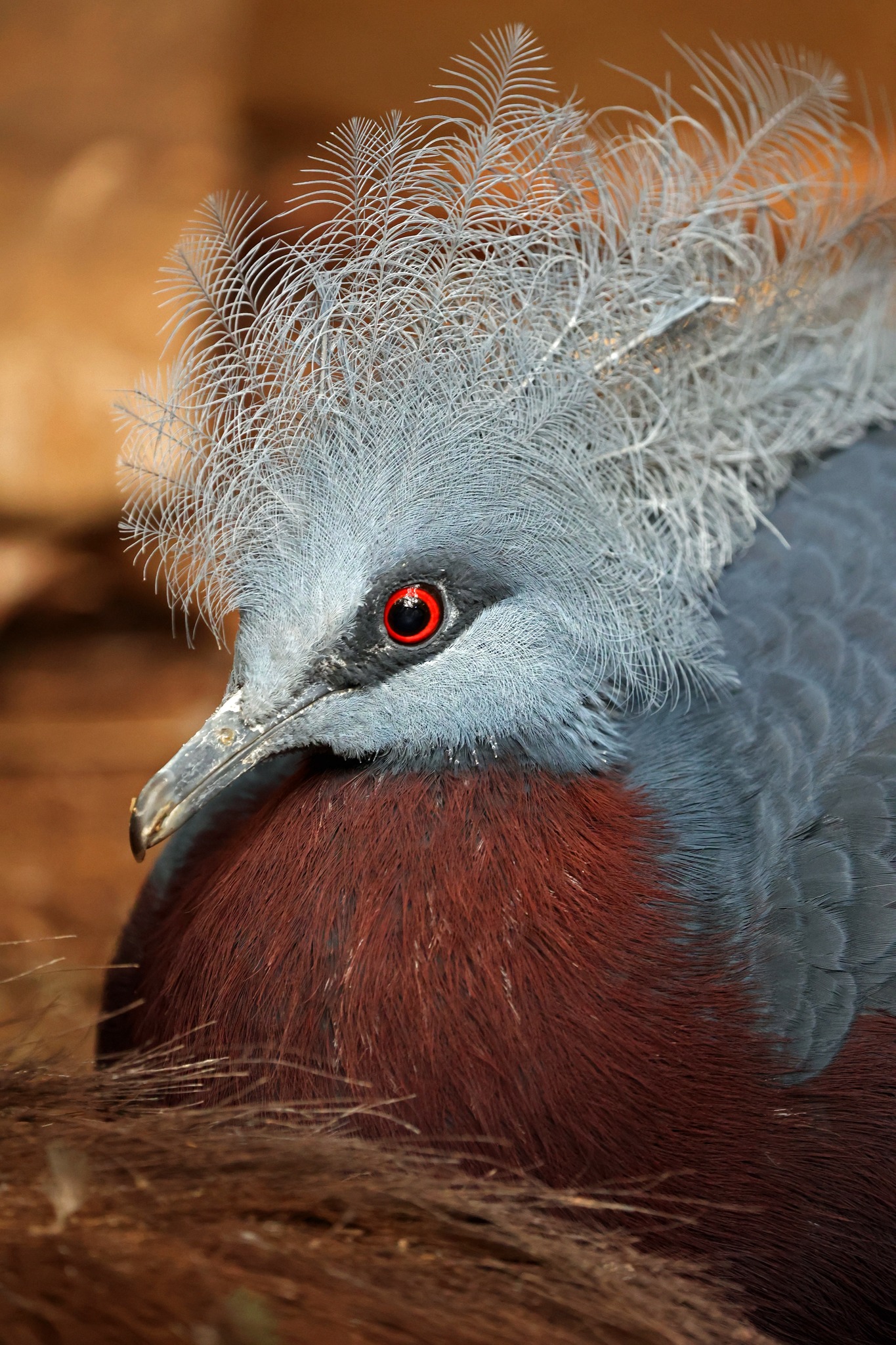 The most prominent feature of these pigeons is the blue-gray lacy feathers adorning their heads. The rest of the body is mainly blue-gray with a maroon breast and belly. It has a black “mask,” red eyes and purplish legs and feet.