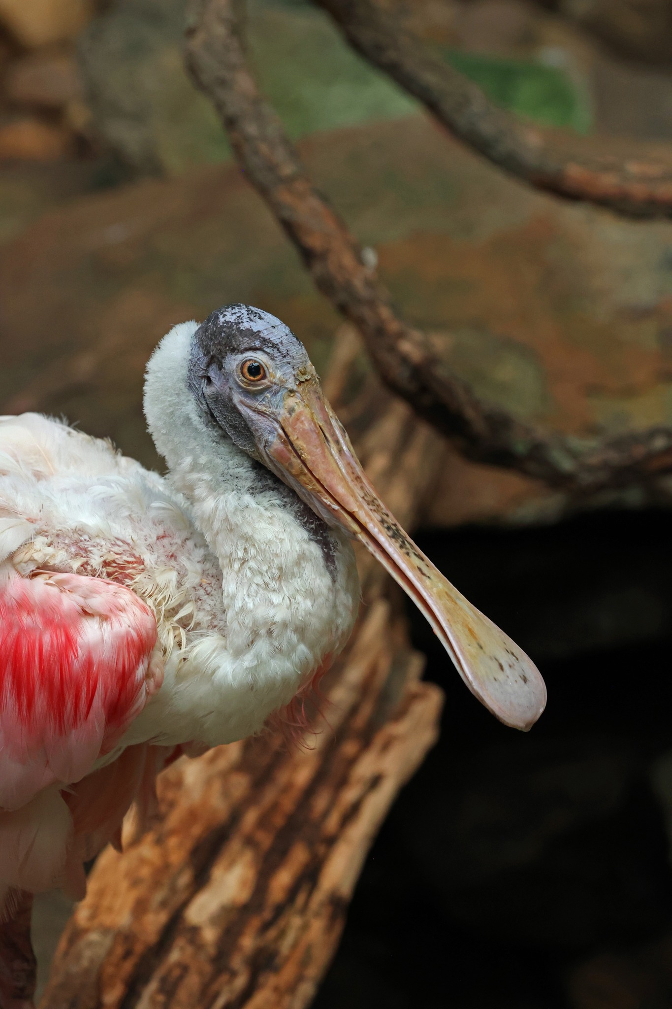 As its name implies, the roseate spoonbill has light to dark pink wings and tail. Their legs and irises are red. The upper back and neck are white but yellow to green tints may be seen. Their most distinctive feature is their large, spoon shaped bill.