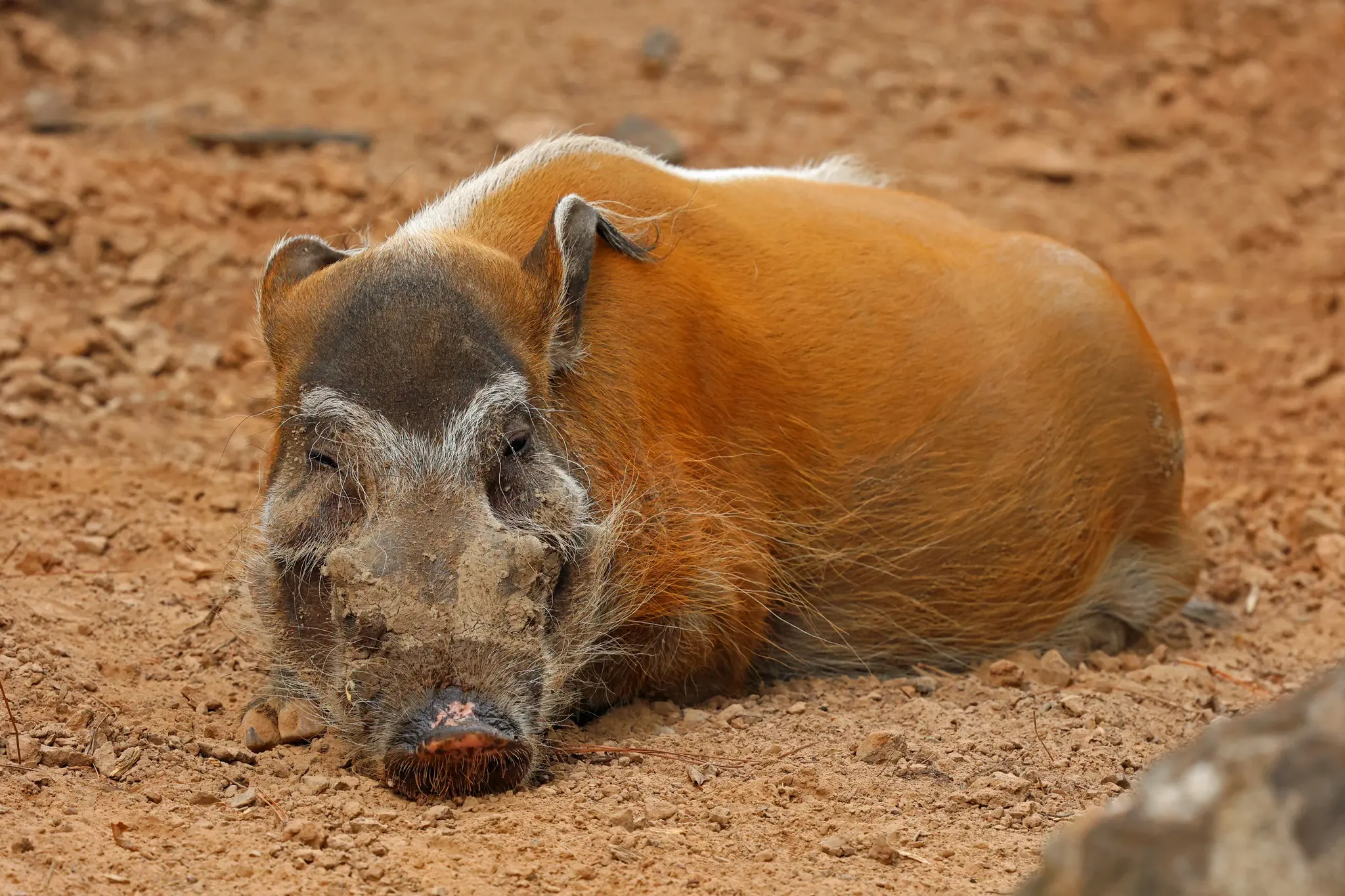 Their coloration can vary greatly because there are 13 subspecies and coloration depends on the region they are from. Here at the Little Rock Zoo they are red with white stripes. Red river hogs can get up to 3-5 feet in length. Both sexes have tusks, however males have warts above their eyes and females do not.