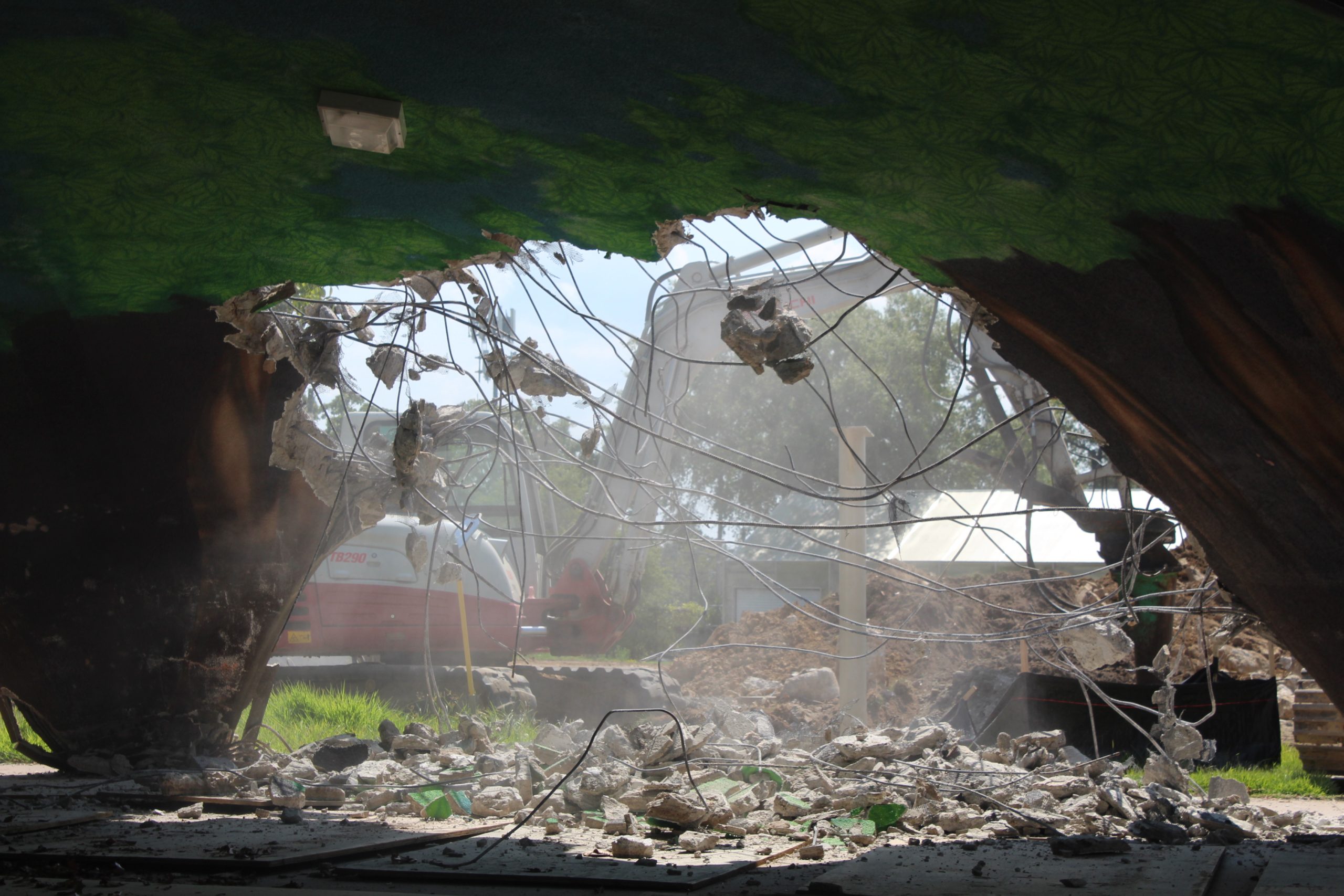 At the same time, demolition of the Mushroom/Echo Dome continued. Crews had begun cutting at the base of the structure in Week 6 to expose the steel rebar skeleton. This week, heavy machinery was used to carefully push the Dome over, and crews began crushing the concrete into rubble for reuse elsewhere on site.
