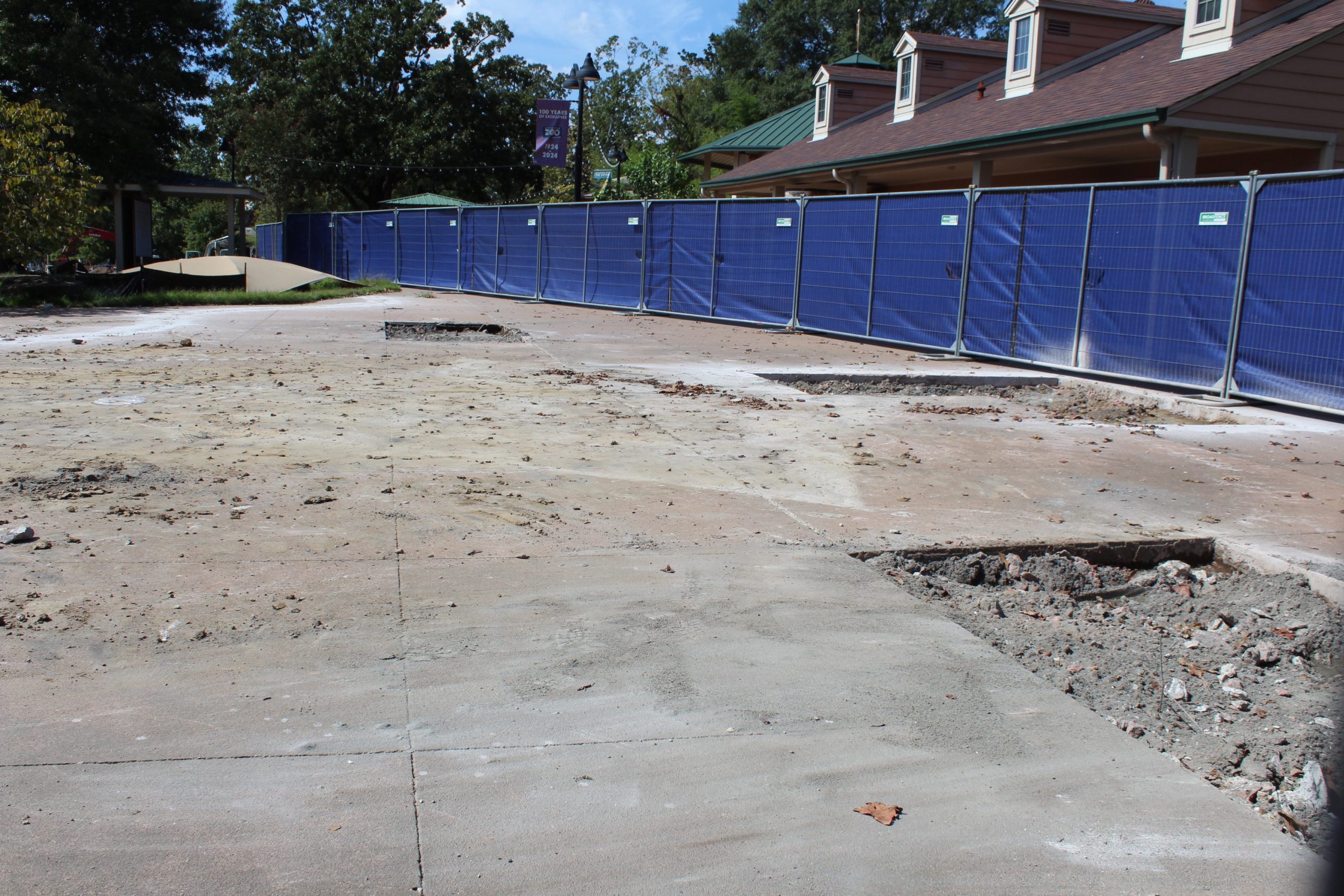 Crews completed the bulk of the Mushroom/Echo Dome demolition this week. While most of the concrete has been set aside and crushed for reuse, several anchor points where the Dome’s rebar was embedded remained in the ground. Crews carefully cut out these remaining sections, leaving holes in the concrete that will be addressed in the coming week(s). Once these anchor points are removed and the area is resurfaced, construction fencing will be pushed back, opening more of the entry plaza for guests.