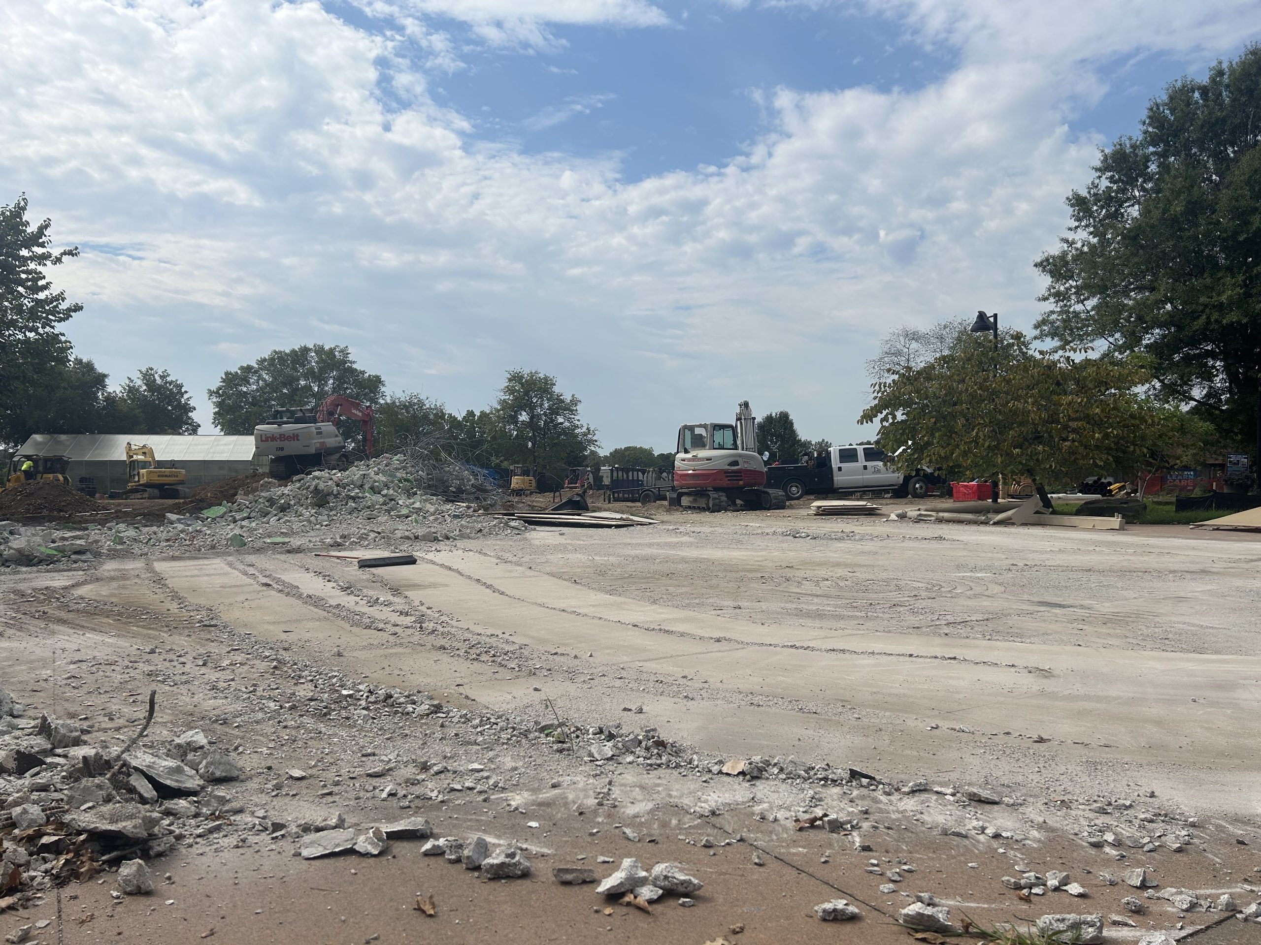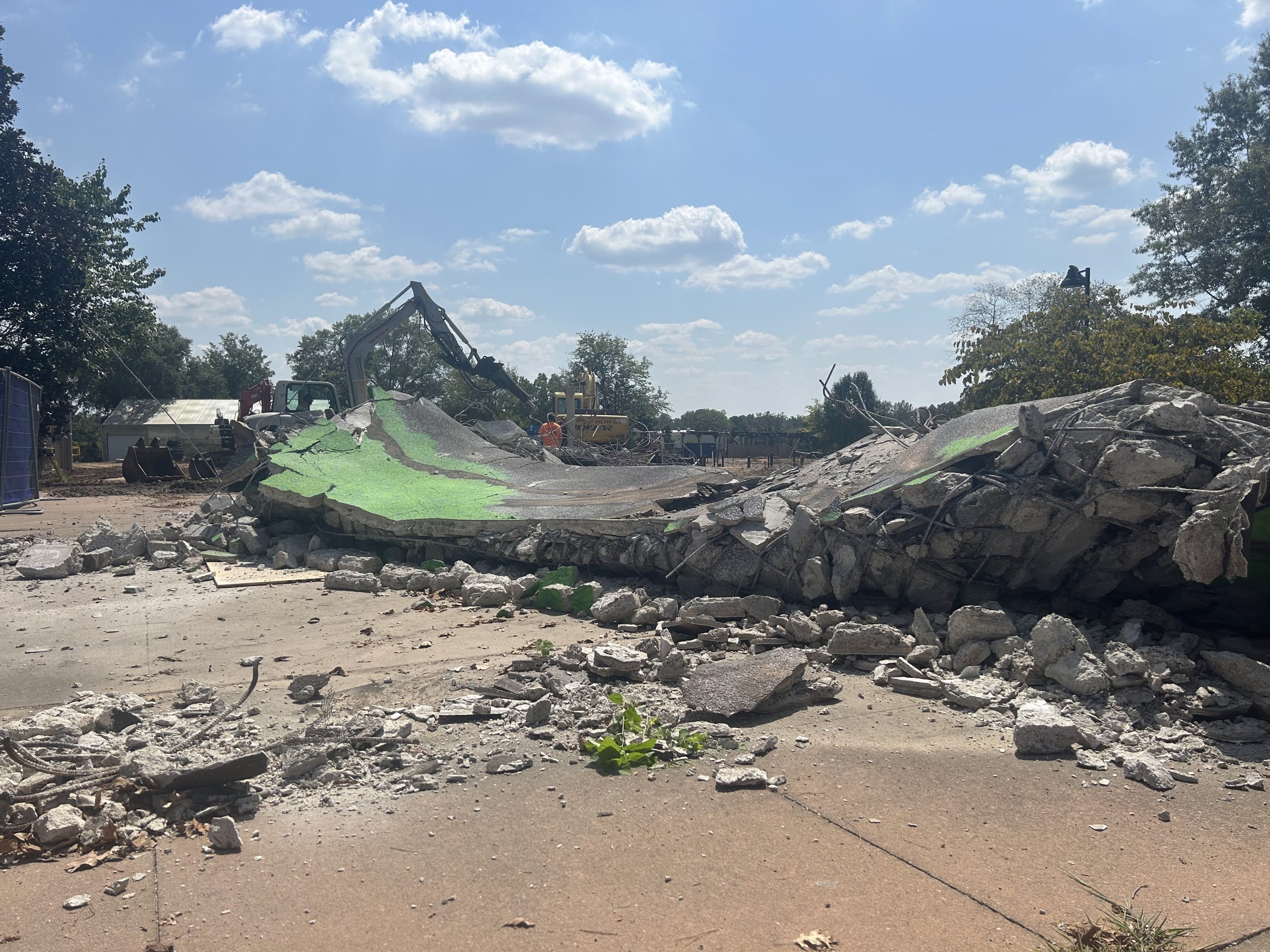 Demolition of the Mushroom/Echo Dome progressed. Crews continued crushing and removing concrete and steel, carefully managing debris for recycling and preparing the area for eventual resurfacing and entry plaza improvements.