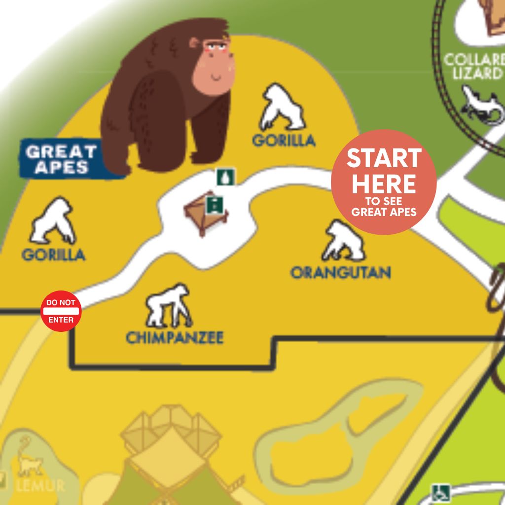 - Great Apes: Access is available through the entrance next to the orangutans. You can still see all of the great ape habitats—including orangutans, chimpanzees, and gorillas—before returning the way you came.