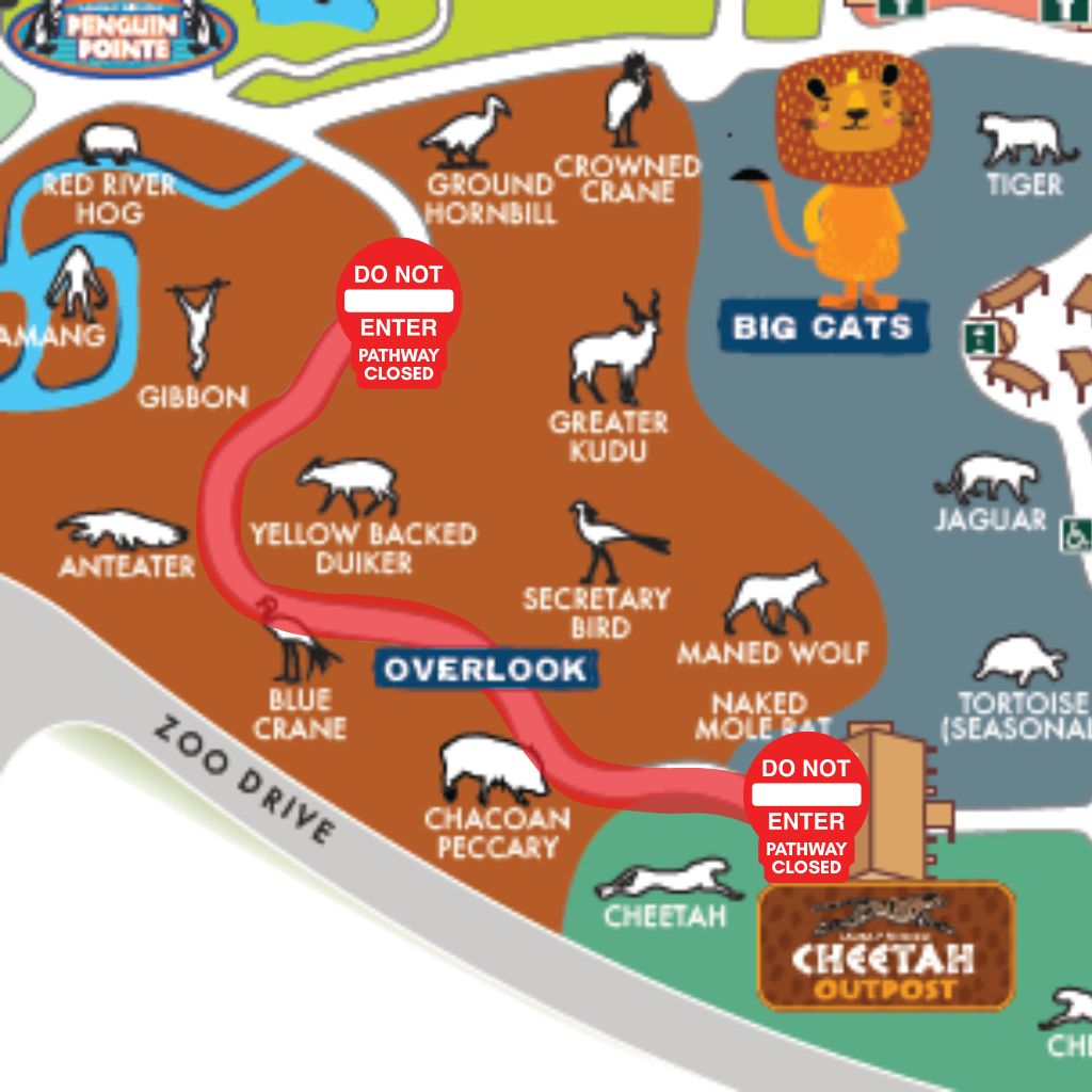 - The Overlook Path: This walkway, between Penguin Pointe and Cheetah Outpost, is currently closed. While a portion of the path is temporarily inaccessible, guests can still view the cheetahs and maned wolves from the Cheetah Outpost viewing decks. Cheetah Outpost remains open but cannot be accessed from this pathway—guests will need to enter from the opposite side near Big Cats.